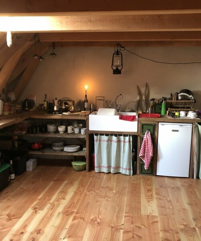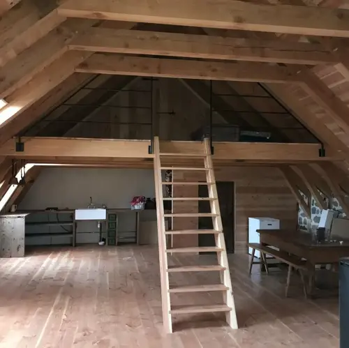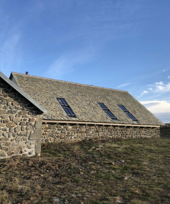 Au coeur du Pays de Salers la rénovation d'un buron et de son bédélat s'est terminée en 2021 après 900 jours de travail. L'agence a eu en charge la gestion du chantier en mission complète, qui a commencé en octobre 2018 par la reprise en urgence du pignon du buron et la consolidation de sa voute. Les travaux se sont poursuivis en 2019 avec l’aménagement des 900 mètres de piste et la réfection du bédélat qui dispose d’une grande salle à rez de chaussée et d’un coin douche. Les couchages sont disposés dans la pointe de charpente. Le porte d'entée, la charpente et les murs en pierres créent une ambiance rustique autour d'un poêle à buches. |