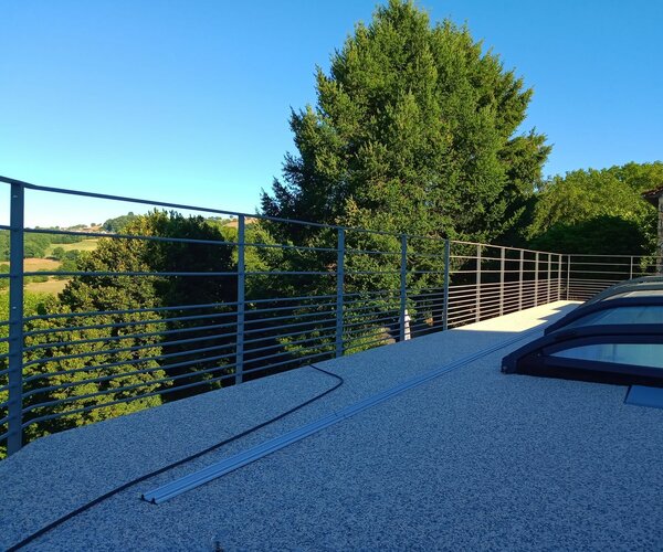 La situation en pente du terrain offre au projet une vue imprenable sur la vallée. L’horizontalité des plages est soulignée par celle du garde-corps.